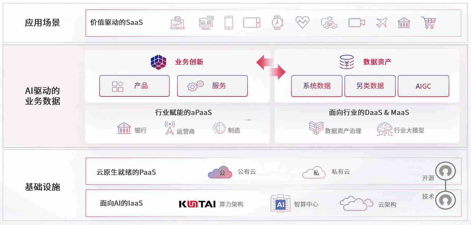 数字时代,,,,围绕企业数字化转型的关键要素,,,J9娱乐数码开创性的提出数云融合战略和技术体系框架,,,,着力在云原生、、、数字原生、、、AI原生和信创产业上架构产品和服务能力,,,,为处在不同数字化转型阶段的快消零售、、、、汽车、、、、金融、、、医疗、、、政企、、教育、、、运营商等行业客户提供泛在的敏捷IT能力和融合的数据驱动能力,,构建跨界融合创新的数字业务场景和新业务模式,,,助力企业级客户建立面向未来的核心能力和竞争优势,,全面推动社会的数字化、、、智能化转型升级。。。