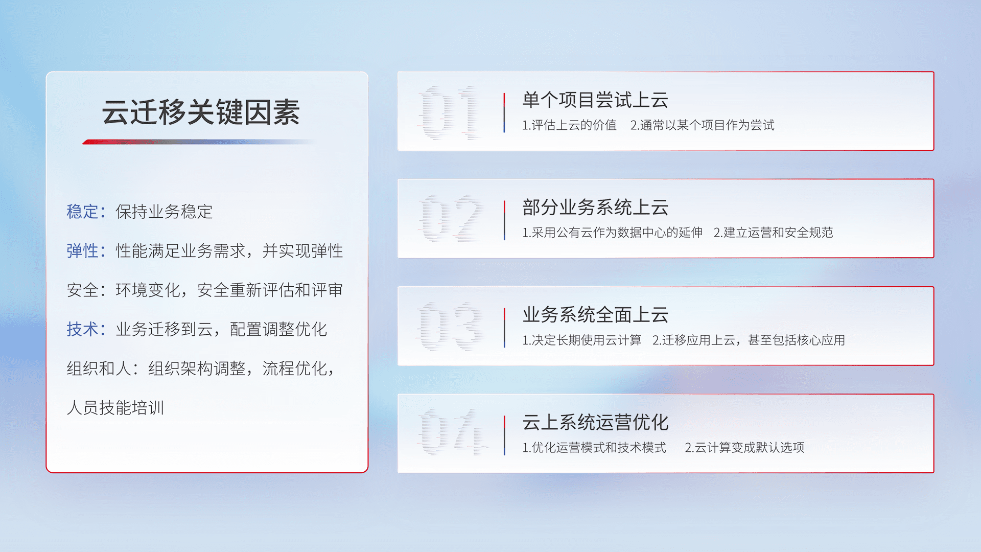 结合实际业务,,,,从规划设计、、、、云平台选型、、、、云原生改造、、、、数据迁移、、、、集成交付,,迁移全过程为客户识别最佳上云路径,,,,做好风险识别管理,,,,设计网络架构、、、身份权限、、安全审计合规、、操作审计、、、、日志审计、、监控告警策略、、、、多站点容灾设计等,,,对云上基础设施进行整体规划,,,提升IT治理水平,,,,以满足弹性、、高可用、、、高性能的需求。。。