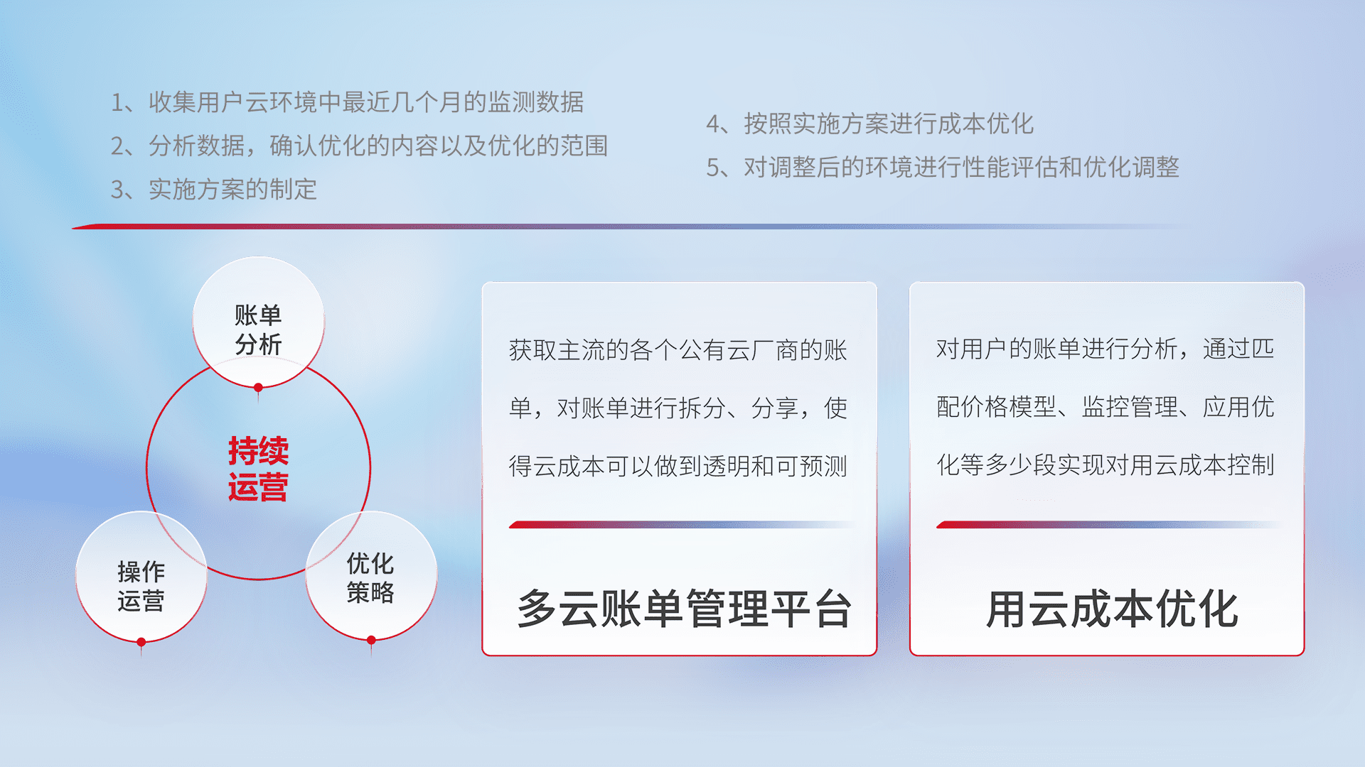 通过多云纳管,,,以统一的资源数据模型把客户的云资源进行抽象和封装,,进而实现对多云资源的统一操作,,,保障云资源管理的可靠性、、、稳定性与可用性。。量身定制化运维内容,,配置、、、开发运维、、补丁管理、、、备份、、、、监控、、认证和访问管理、、、、审计和日常巡检等,,保障在用云过程中的可靠度,,,稳定度以及高可用率。。。。
